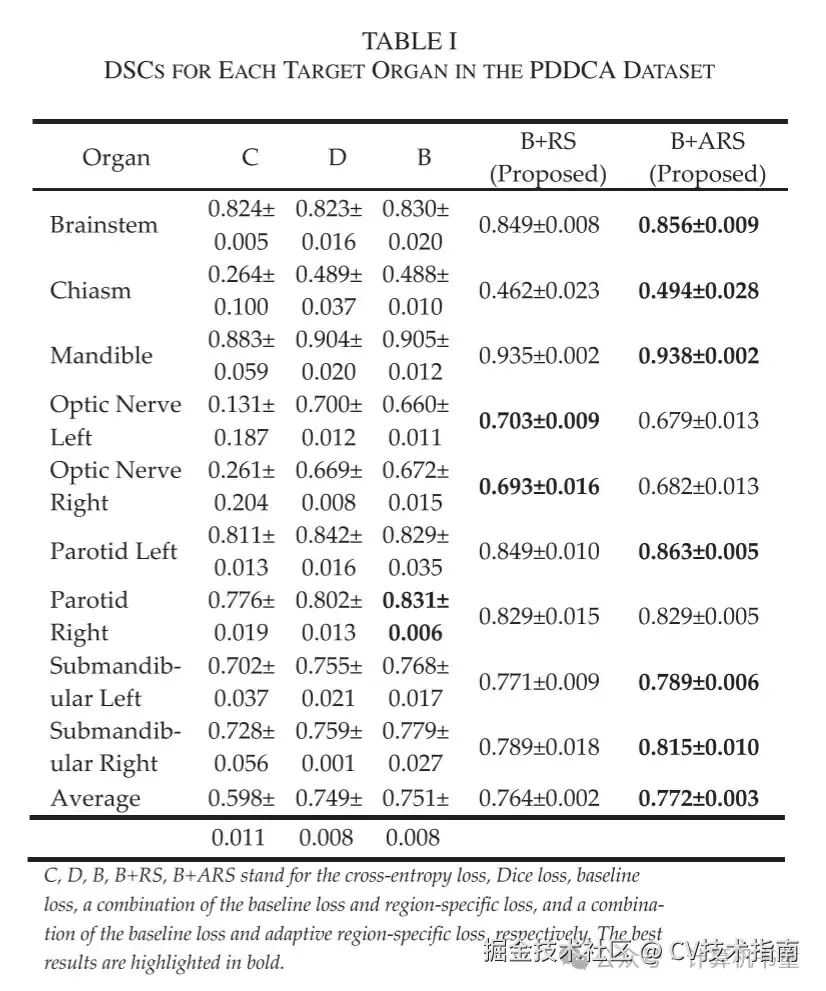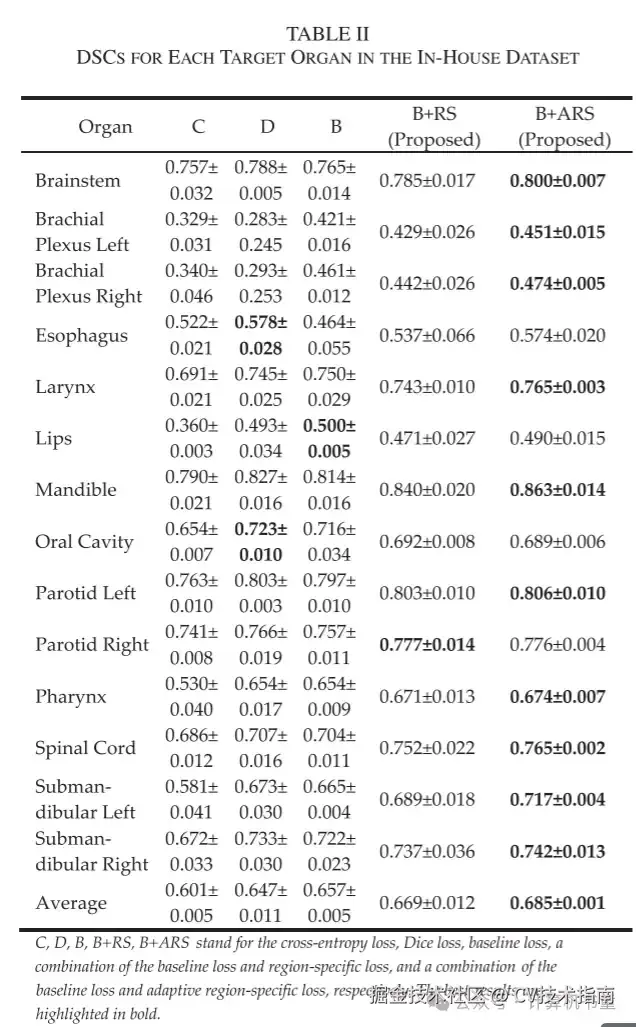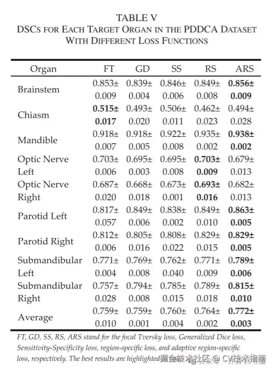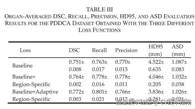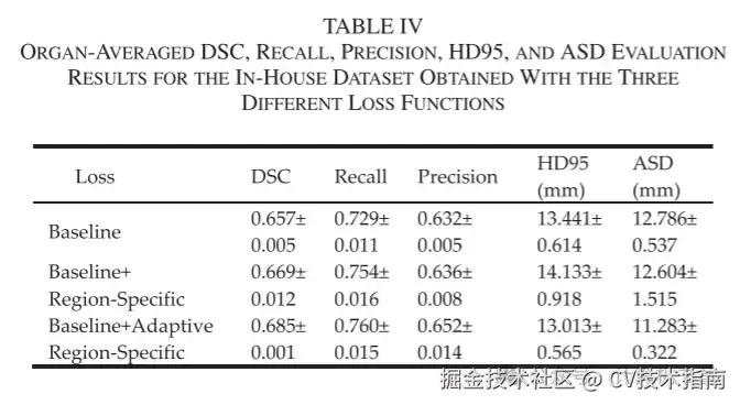 与基线损失相比,PDDCA 数据集中 9 个器官中的 8 个和内部数据集中 14 个器官中的 12 个在训练期间引入区域特定增强或自适应误差惩罚后 DSC 结果有所提高。以下颌骨为例,在 PDDCA 数据集和内部数据集上,使用两种提出的损失函数分别将 DSC 提高了 0.030 和 0.033,以及 0.026 和 0.049。表格 III 和 IV 显示了使用三种不同损失函数在 PDDCA 和内部数据集上获得的每个器官的平均 DSC、召回率、精确度、HD95 和 ASD 的评估结果。除了平均 DSC 外,平均召回率、精确度、HD95 和 ASD 也几乎通过区域特定损失得到了改善,为其实效性提供了更多证据。此外,引入自适应误差惩罚进一步提高了平均 DSC、HD95 和 ASD 值。我们注意到它对两个数据集的召回率和精确度的影响是不同的。对于 PDDCA 数据集,平均召回率增加了 0.023(从 0.778 到 0.801),而精确度降低了 0.012(从 0.778 到 0.766),表明为了提高召回率,精确度略有牺牲。对于内部数据集,召回率仅增加了 0.006,而精确度增加了 0.016。
