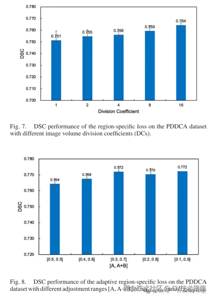 - 消融研究:为了进一步验证所提出的区域特定损失和自适应区域特定损失的有效性,我们进行了一些消融研究,主要在 PDDCA 数据集上。首先,我们研究了子区域划分对区域特定损失性能的影响。通过使用不同的划分系数(DCs),范围从 1 到 16,这意味着整个图像体积被均匀地划分为 DC × DC × DC 子区域,区域特定损失在公共 PDDCA 数据集上的 DSC 性能如图 7 所示。值得注意的是,DC = 1 对应于传统的全局 Dice 损失。结果表明,随着划分的子区域数量增加和每个子区域的体积减小,区域特定损失的性能逐渐提高。