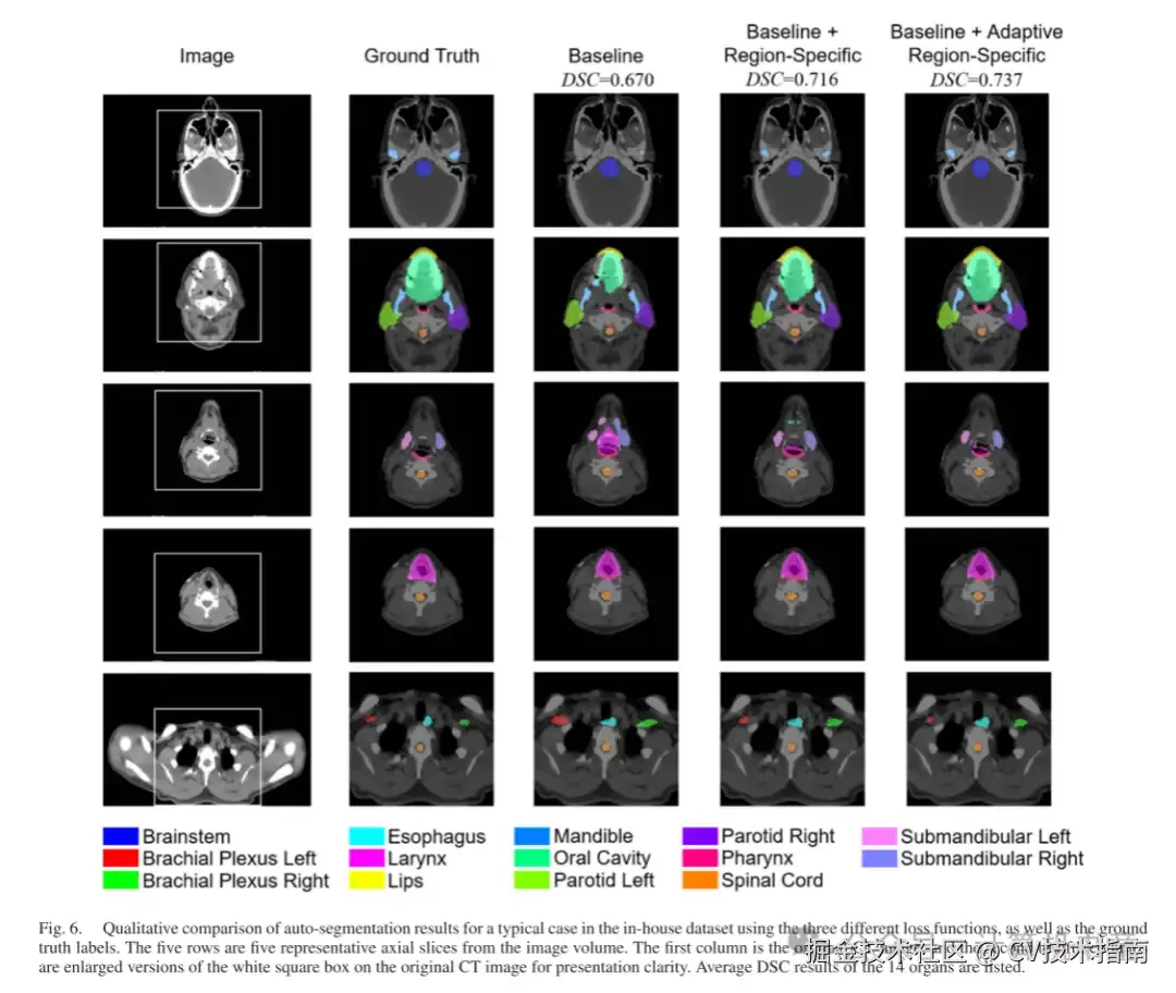 - 定性结果:图 5 和 6 展示了自动分割结果的定性分析。通过使用区域特定损失和自适应区域特定损失,预测的器官掩模得到了改善,并且更接近真实标注标签,明显优于基线结果。以右侧下颌下腺为例,如图 5 的最后一行和图 6 的第三行所示,基线网络倾向于预测比真实标注标签大得多的掩模。这通过所提出的损失函数得到了纠正。通过目视检查预测掩模,我们的方法有望用于临床自动分割。