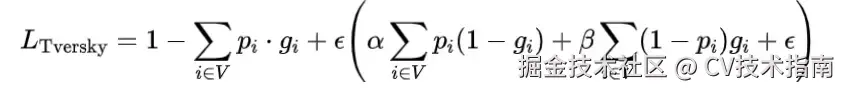 在像素级分割学习中,网络尝试最大化真正例(TP)预测并最小化假正例(FP)和假负例(FN)误差。DSC可以被视为精确度(P = TP/(TP + FP))和召回率(R = TP/(TP + FN))的调和平均[30],因此在Dice损失函数中,FP和FN被同等加权。对于医学图像分割,一些目标器官的体积通常比背景体积要小得多,这可能导致严重的数据不平衡问题,使网络预测偏向背景,FN误差在网络训练期间往往比FP误差更为主导。为了在精确度和召回率性能之间实现更好的权衡,开发了Tversky损失函数[35],定义如下: