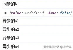 分析:前四个yield表达式后面都是setTimeout异步代码,会按顺序加入任务队列;执行到第5个yield ,后面是同步代码,会打印出同步的b ,之后返回 {value: undefined, done: false} ,同步任务完成后再从任务队列中依次执行刚刚的异步任务。 注意:如果一次性调用的是6次g.next() ,则打印完同步的b后返回的是 {value: undefined, done: true} 。