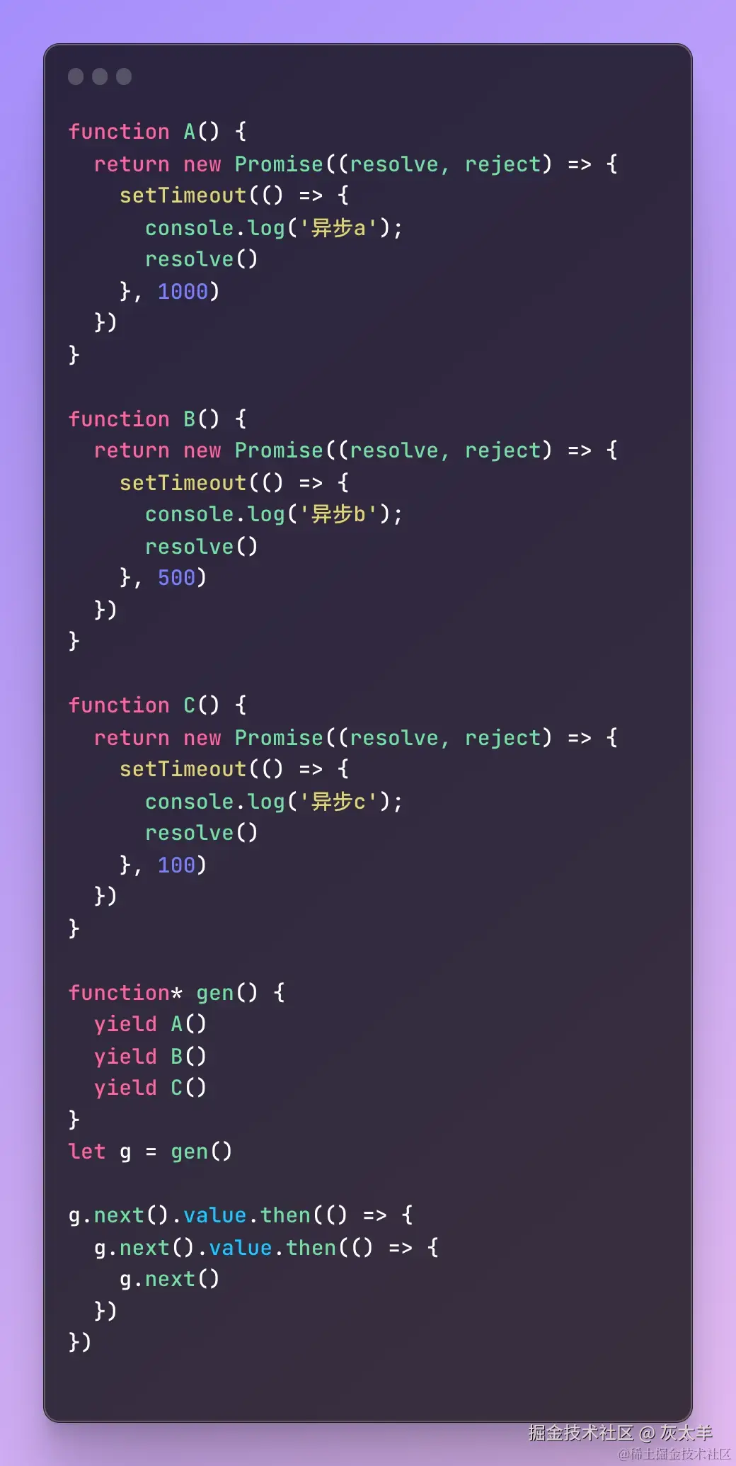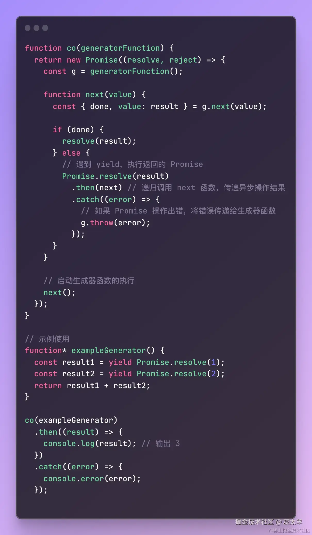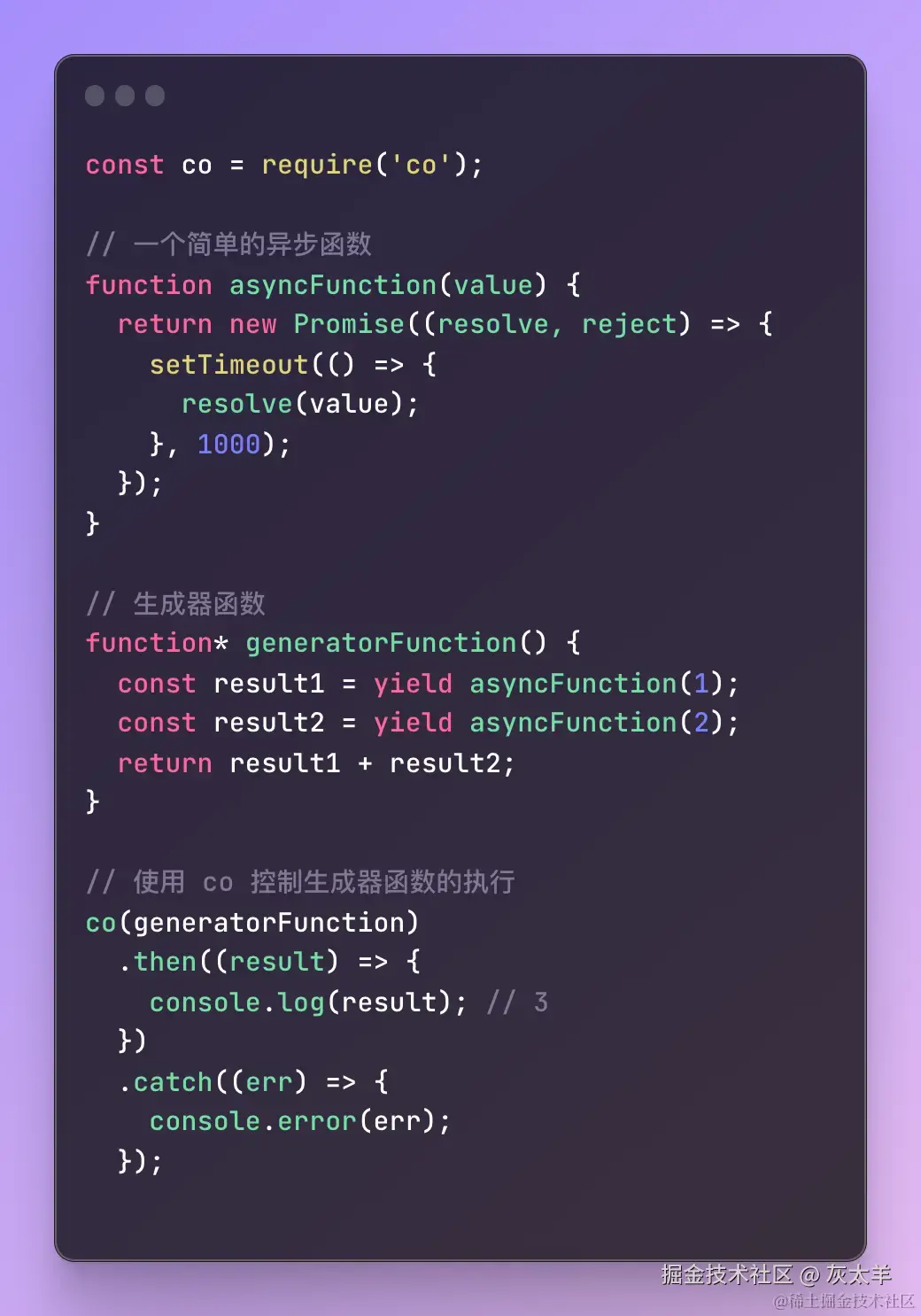 - co 函数是一个库或工具,它使用 Promise 和生成器函数的协作来实现异步控制。co 内部会自动执行生成器函数,并管理异步操作的执行流程。