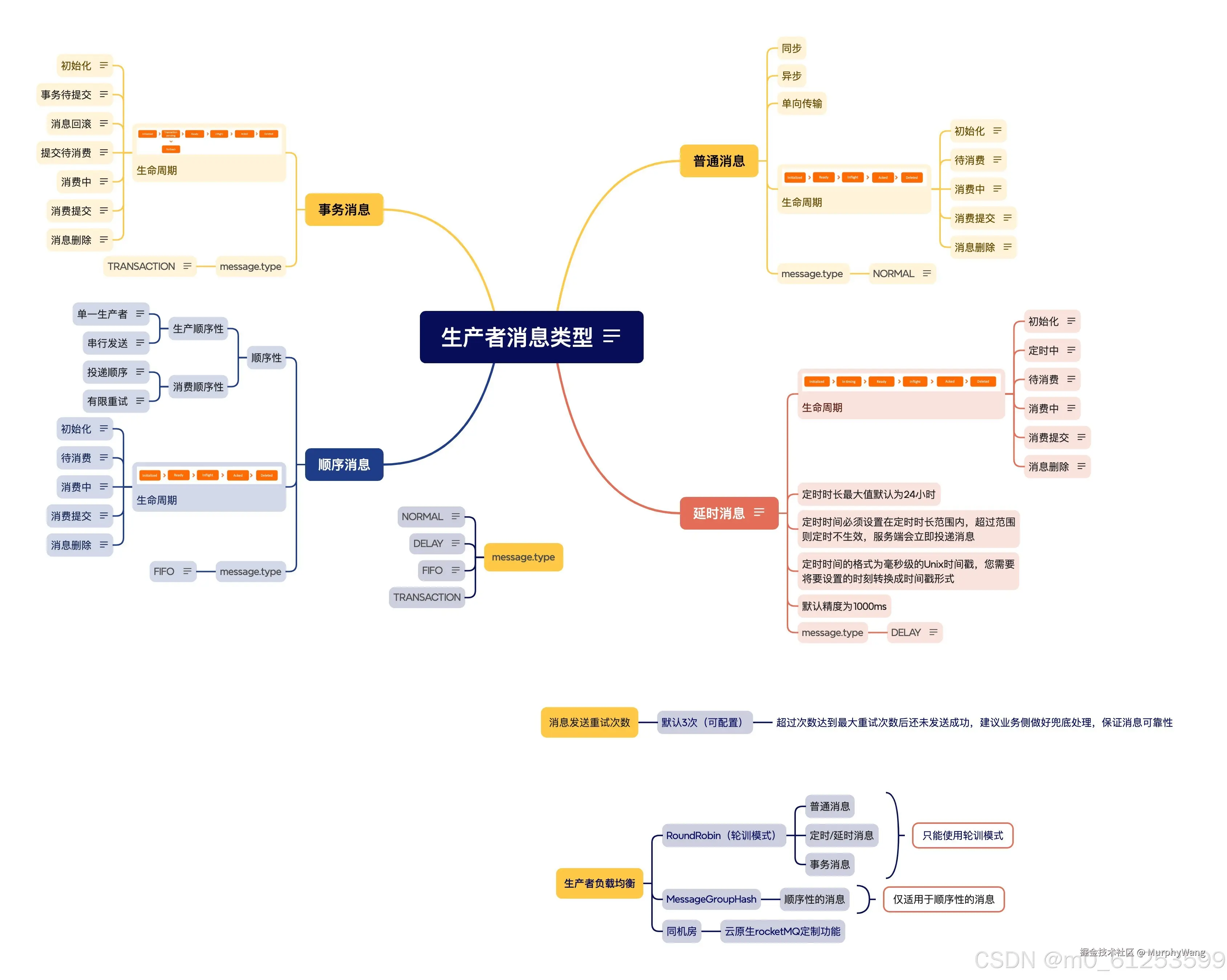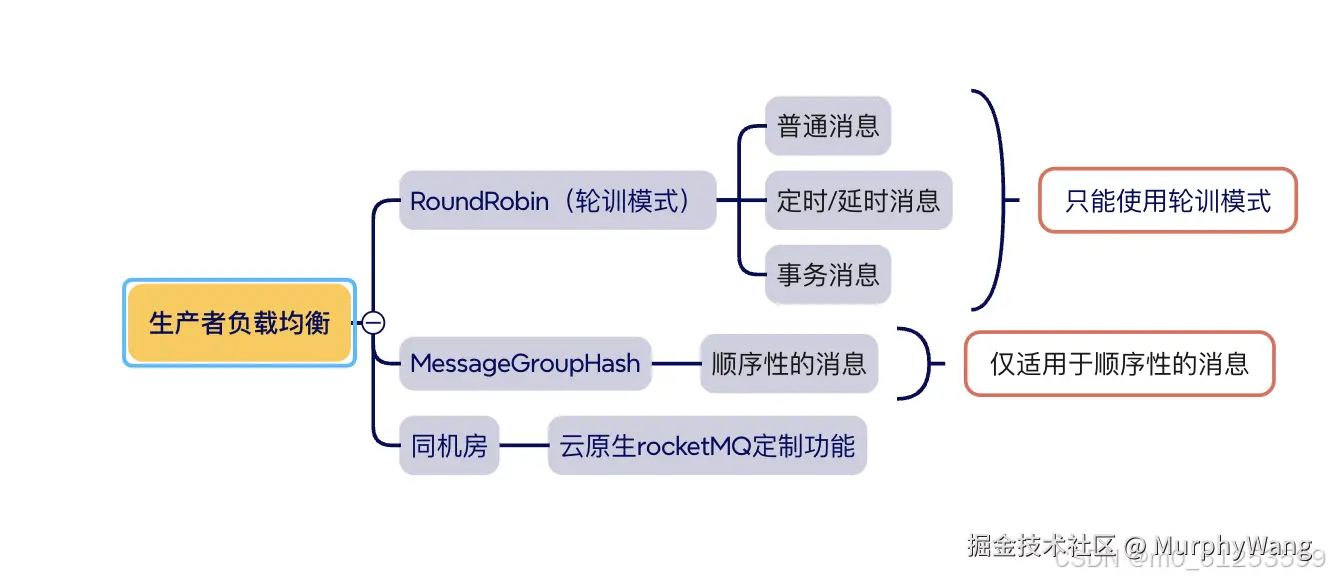 RocketMQ5.0 生产者 MurphyWang 2024-08-18 41 阅读1分钟 生产者消息类型: 生产者的负责均衡 生产者在发送消息时sdk会根据负载均衡策略,将消息发送到topic不同的messagequeque。