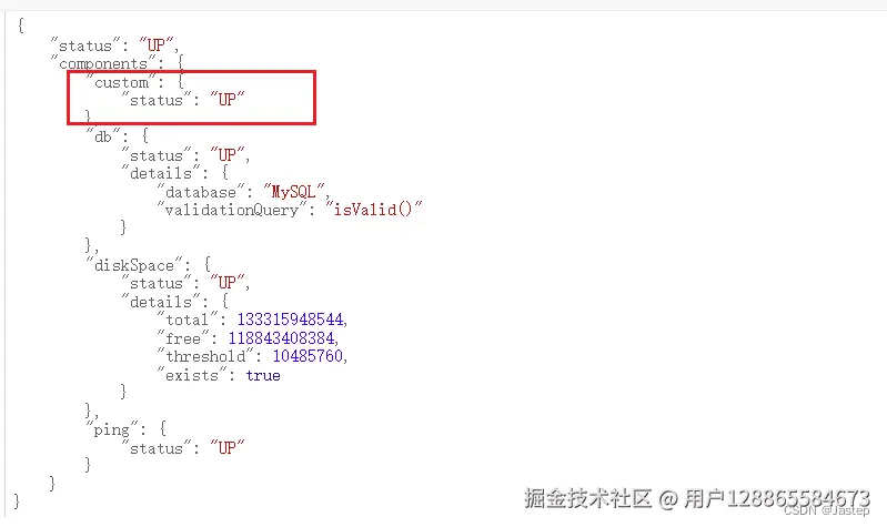 访问 localhost:8080/actuator/health 效果如下: