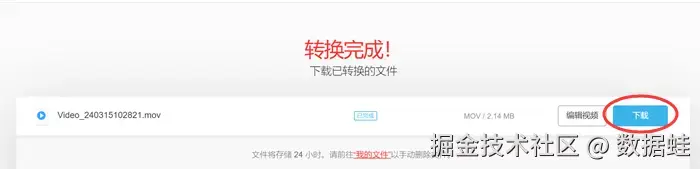 步骤三:点击 【转换按钮】 ,耐心等待视频转换过程。转换完成时,点击 【下载】 按钮,将转换后的mp4文件保存到本地设备中。