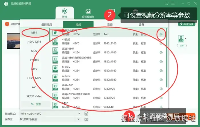 步骤二:点击屏幕左下角的 【输出格式】 ,然后在弹出的窗口中,选中 【mp4】 。如需调节参数,请按 【齿轮】 图示进行参数调整。