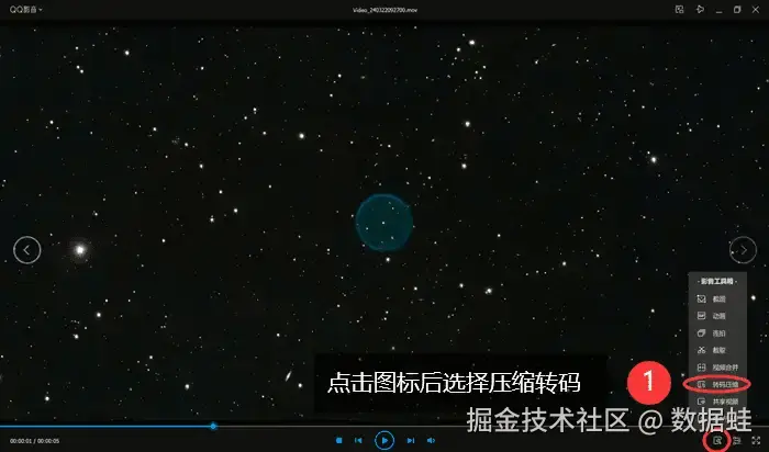 步骤二:在视频播放界面,点击右下角的 【影音工具箱】 图标,便会弹出一个丰富的功能选项列表。从列表中,选择 【压缩转码】 功能,进入视频格式转换的操作界面。