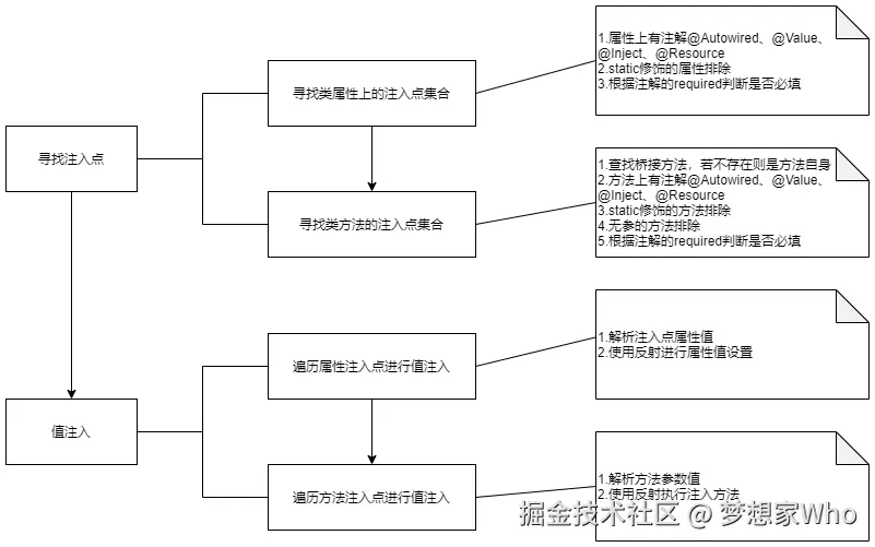 在Spring中,依赖注入(属性填充)对应的核心步骤核心步骤为寻找注入点、进行值注入两步,其流程图如下所示: