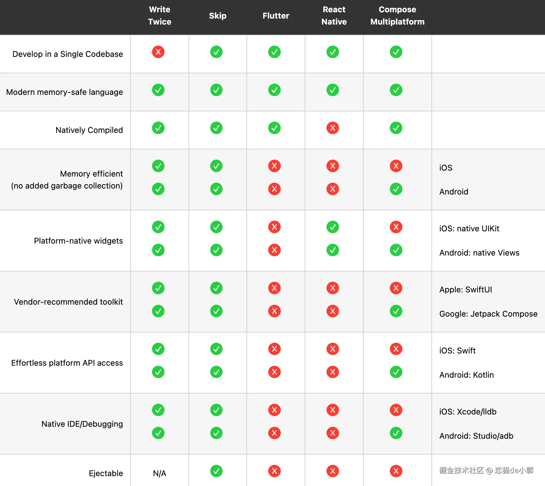 这也算是第一套 iOS 端反卷 Android 的完整跨平台框架,其实这种直接让原生开发支持到另外一端的做法,我个人觉得其实会更受原生开发接受,因为: