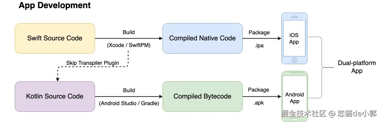 回到 Skip 的实现,在 Skip Engine 内部,它底层采用的是原生平台的框架实现:iOS 上 Swift / SwiftUI,Android 上 Kotlin / Compose,也就是纯纯原生,没有桥接和第三方运行时,事实上 Skip 在 iOS 上会直接调用 Swift 或 Objective C API,在 Android 上直接调用 Kotlin 或 Java API ,所以其实它在 Android 上等于是一个「转译」框架。
