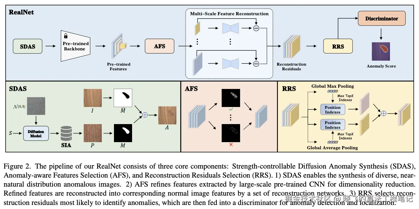 RealNet,集成了三个核心组件:可控制强度的扩散异常合成(SDAS)、异常感知特征选择(AFS)和重构残差选择(RRS)。这些组件通过协同作用,使RealNet能够有效地利用大规模预训练模型来进行异常检测,同时保持计算开销在合理的低范围内。RealNet为未来利用预训练特征重构技术进行异常检测的研究提供了灵活的基础。通过大量实验,展示了RealNet在处理多样化的实际异常检测挑战方面的能力来源:晓飞的算法工程笔记 公众号