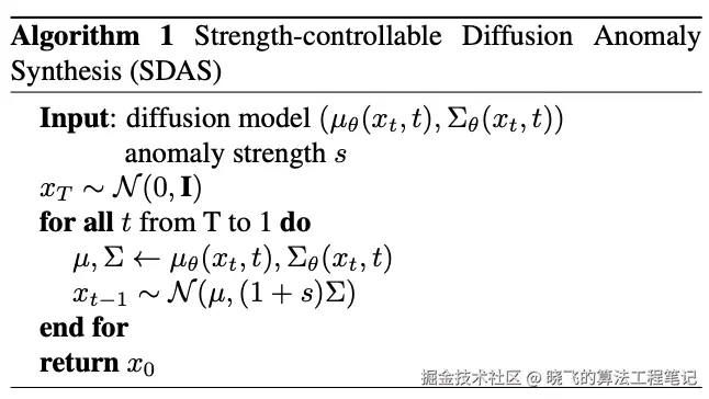 论文将这个过程称为可控强度的扩散异常合成(Strength-controllable Diffusion Anomaly Synthesis,SDAS),详见算法1。具体而言,如果将 设置为0,SDAS将生成正常图像。