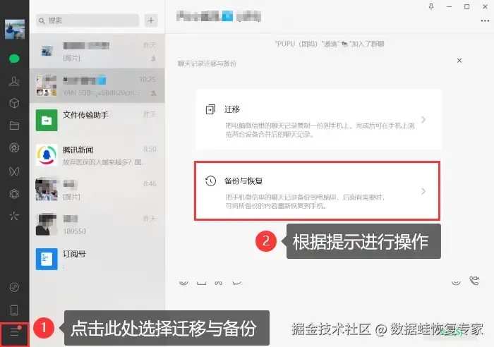 步骤2:在电脑端微信左下角找到 【三横线】 选项,点击后选择 【迁移与备份】 。根据提示选择需要恢复的聊天记录恢复到手机即可。