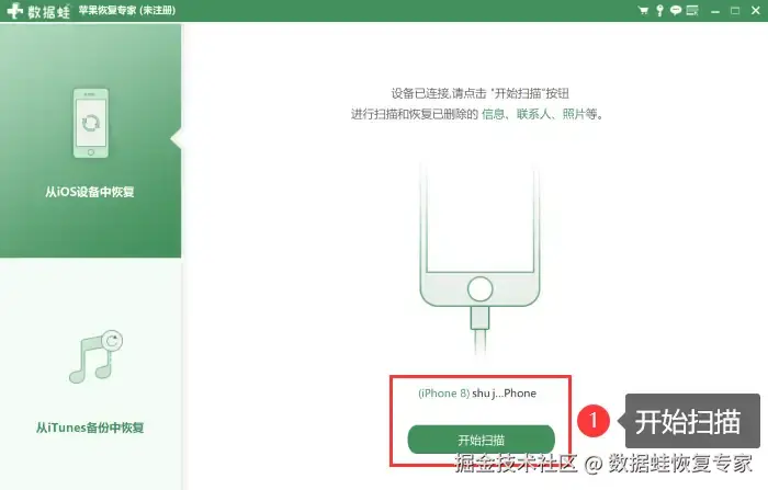 步骤1:在数 据 蛙官网中,下载苹果恢复专家到您的电脑上,打开软件后通过USB数据线把苹果手机与电脑连接起来。连接成功后点击开始扫描。