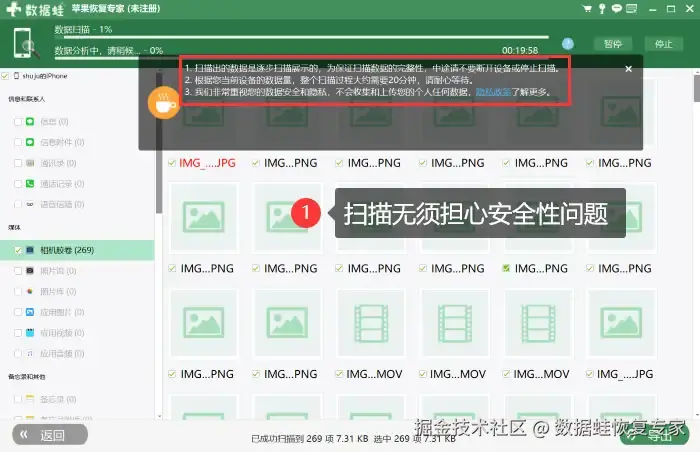 步骤2:在扫描过程中,不要中途断开设备或者停止扫描。也无须担心扫描是否存在安全性问题,软件会绝对保护您的个人隐私。