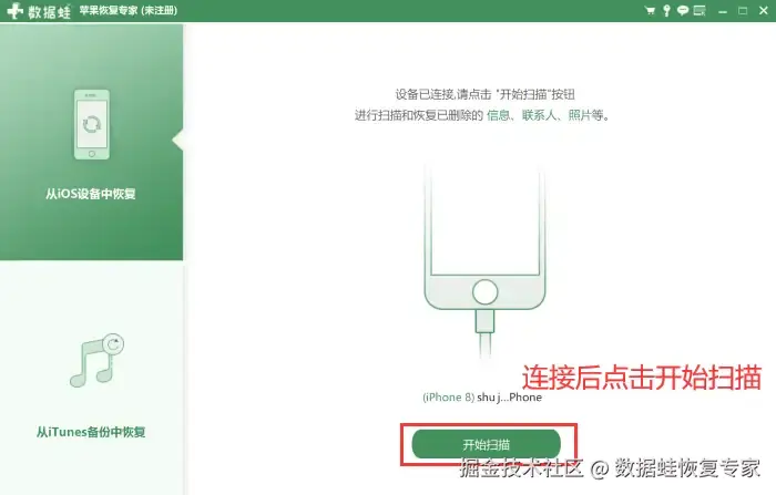步骤1:下载并安装好该软件后,使用USB数据线将苹果手机和电脑连接起来。如果没有提前在iTunes中备份,我们就选择 【从iOS设备中恢复】 模式,点击 【开始扫描】 按钮。