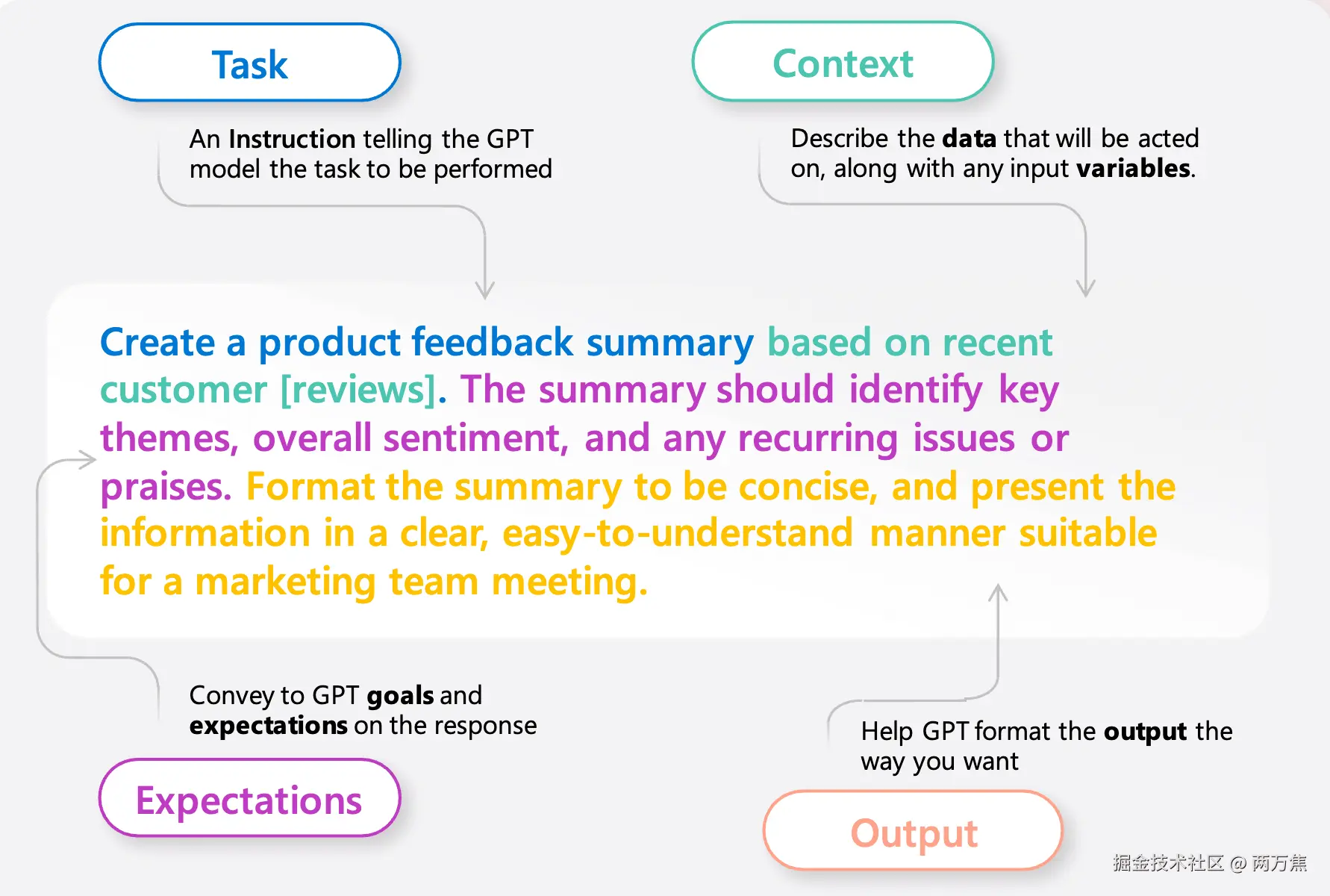 - 解释(Expectations):告诉大模型应该怎么做,比如:总结内容需要确定关键主题、整体情绪以及任何反复出现的问题或赞扬