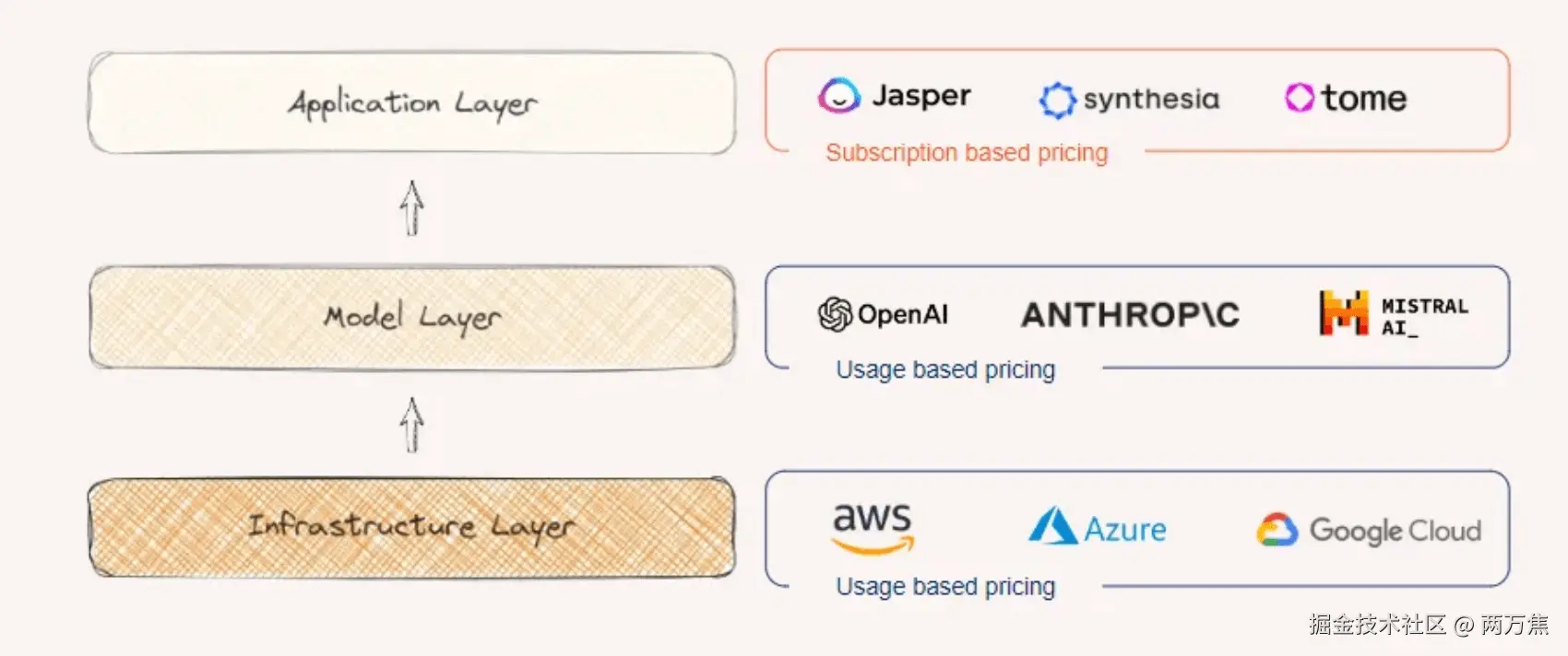 - 应用:绝大多数 AI 产品都在这一层,应用层的产品多数按照订阅制收费