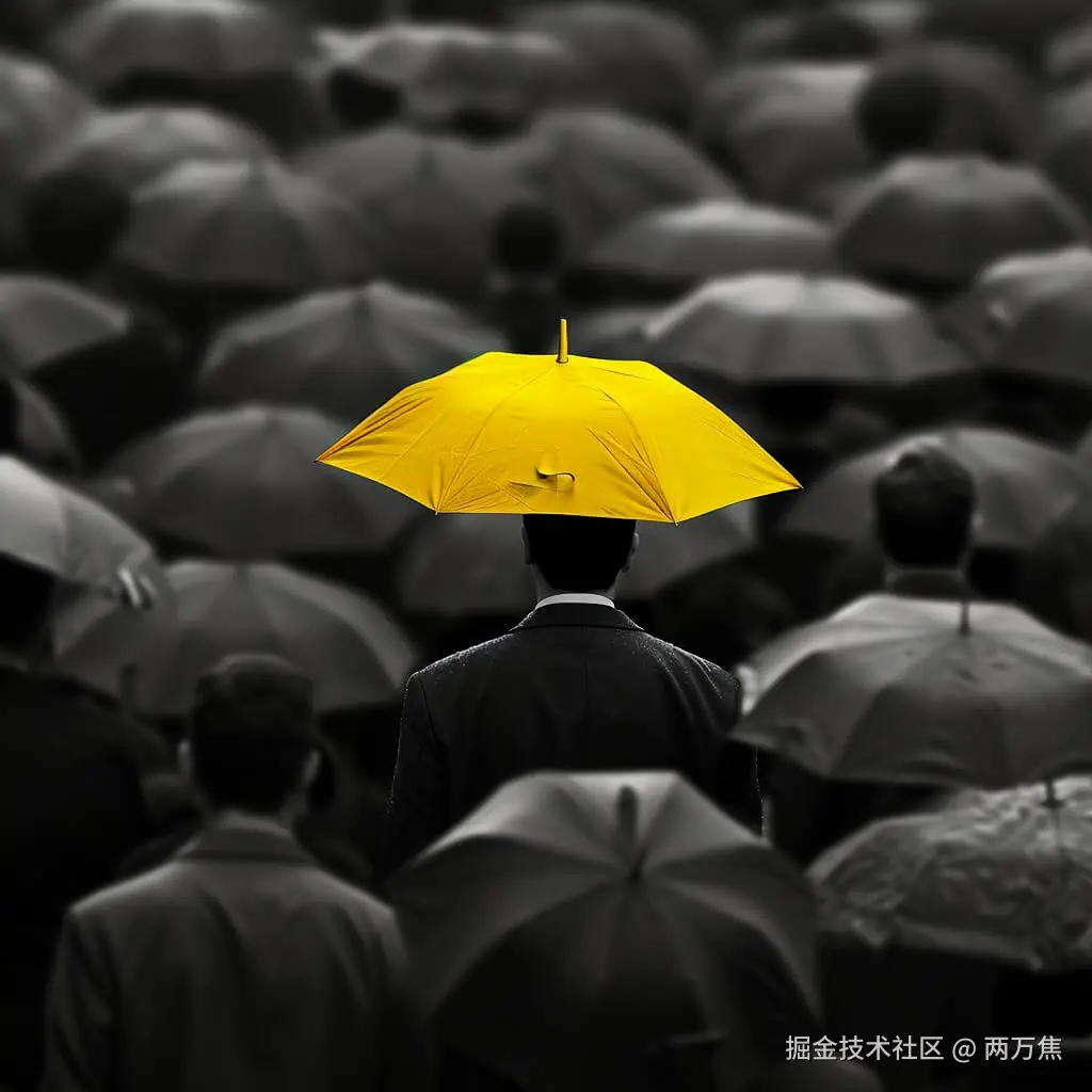Prompt: This compelling image captures a sea of people, all shielded by a canopy of monochromatic umbrellas against a possibly gloomy sky. Amidst this uniform crowd, a single yellow umbrella makes a striking statement. It's a testament to individuality and the courage to stand out in a world often dominated by conformity. The contrast is not just in color, but in spirit, marking the bearer of the yellow umbrella as unique, and perhaps a beacon of optimism in the routine grayness.