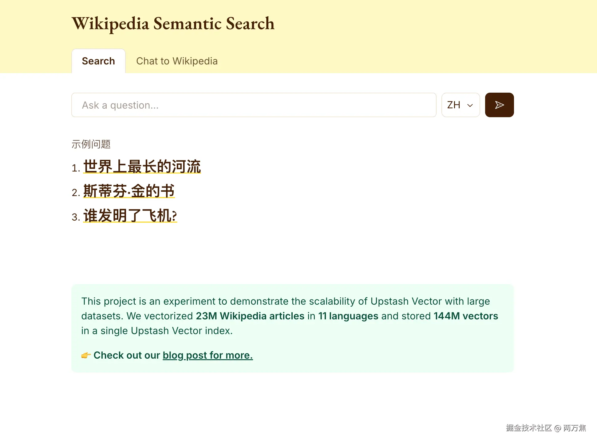 wikipedia-semantic-search:AI 维基百科搜索助手,通过 upstash 索引整个维基百科:11 种语言,700GB 数据,1.44 亿个向量