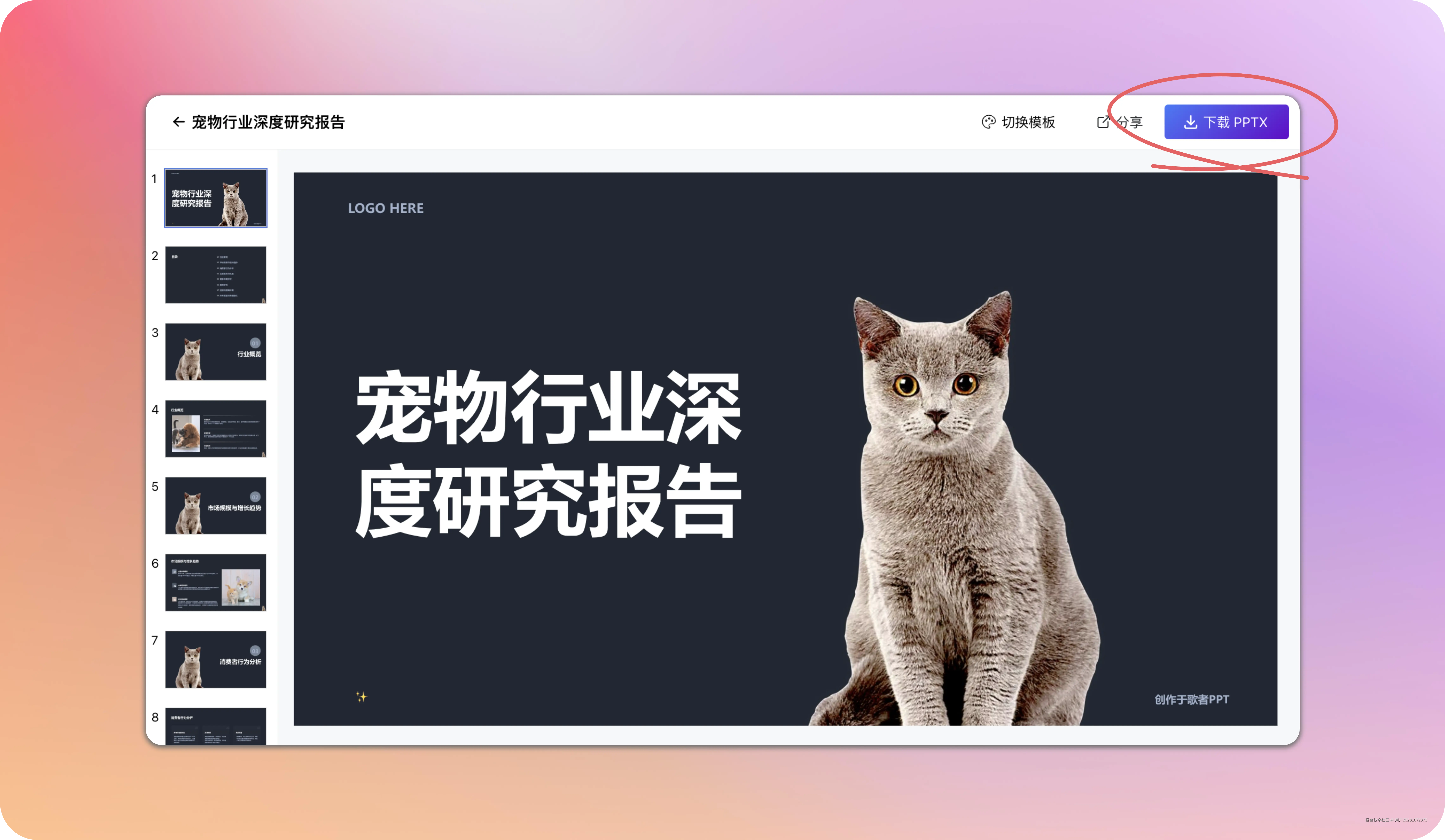 PPT 生成后,用户可直接将 PPTX 文件下载至本地,便于后续在 PowerPoint 或 WPS 中进行深度调整。
