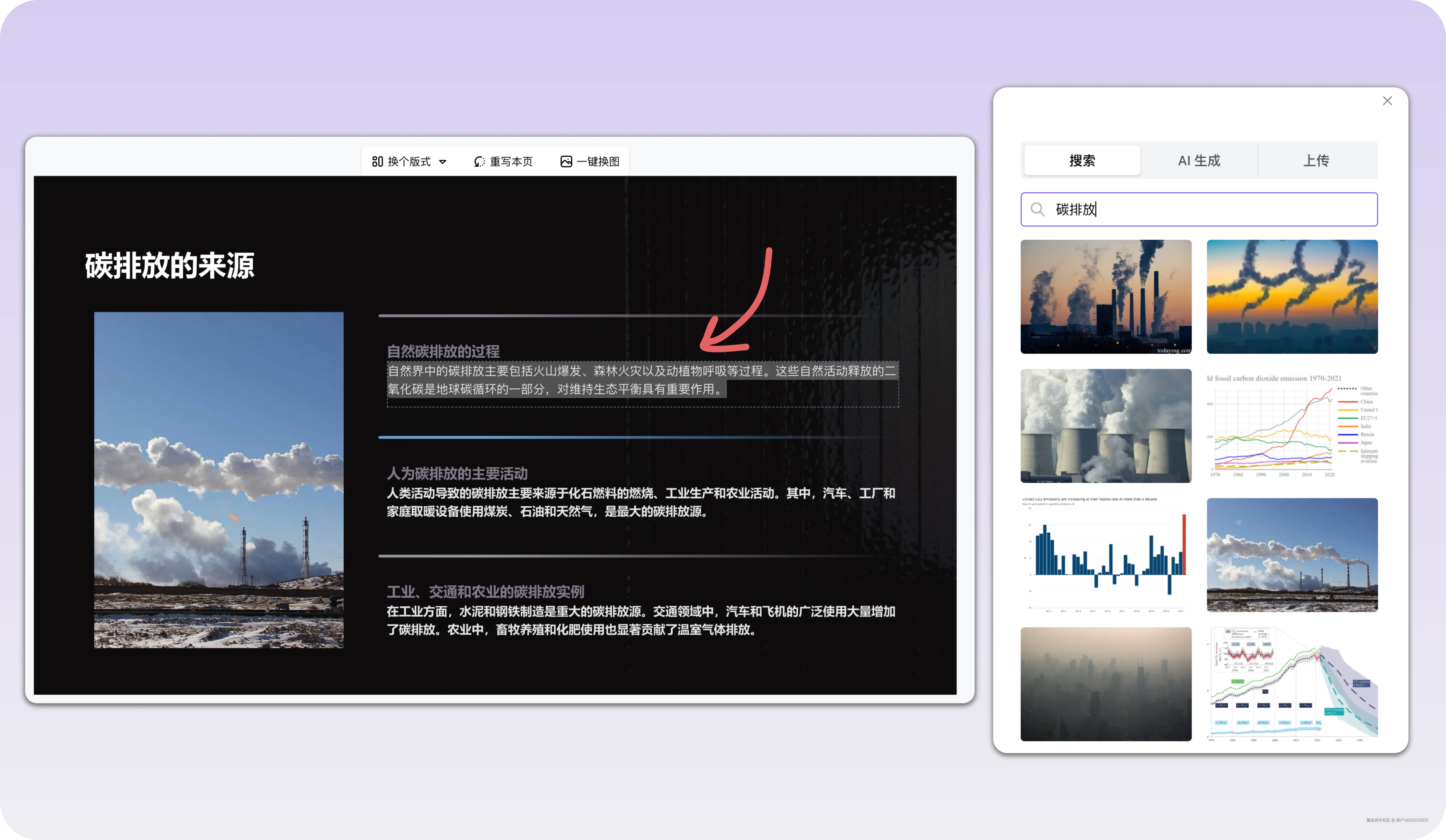生成的 PPT 可以在线直接编辑,无论是修改文字还是配图都非常便捷。想要修改配图?除了支持上传本地素材,还可以在侧边栏直接搜索或 AI 生成所需图片,编辑过程简单高效。