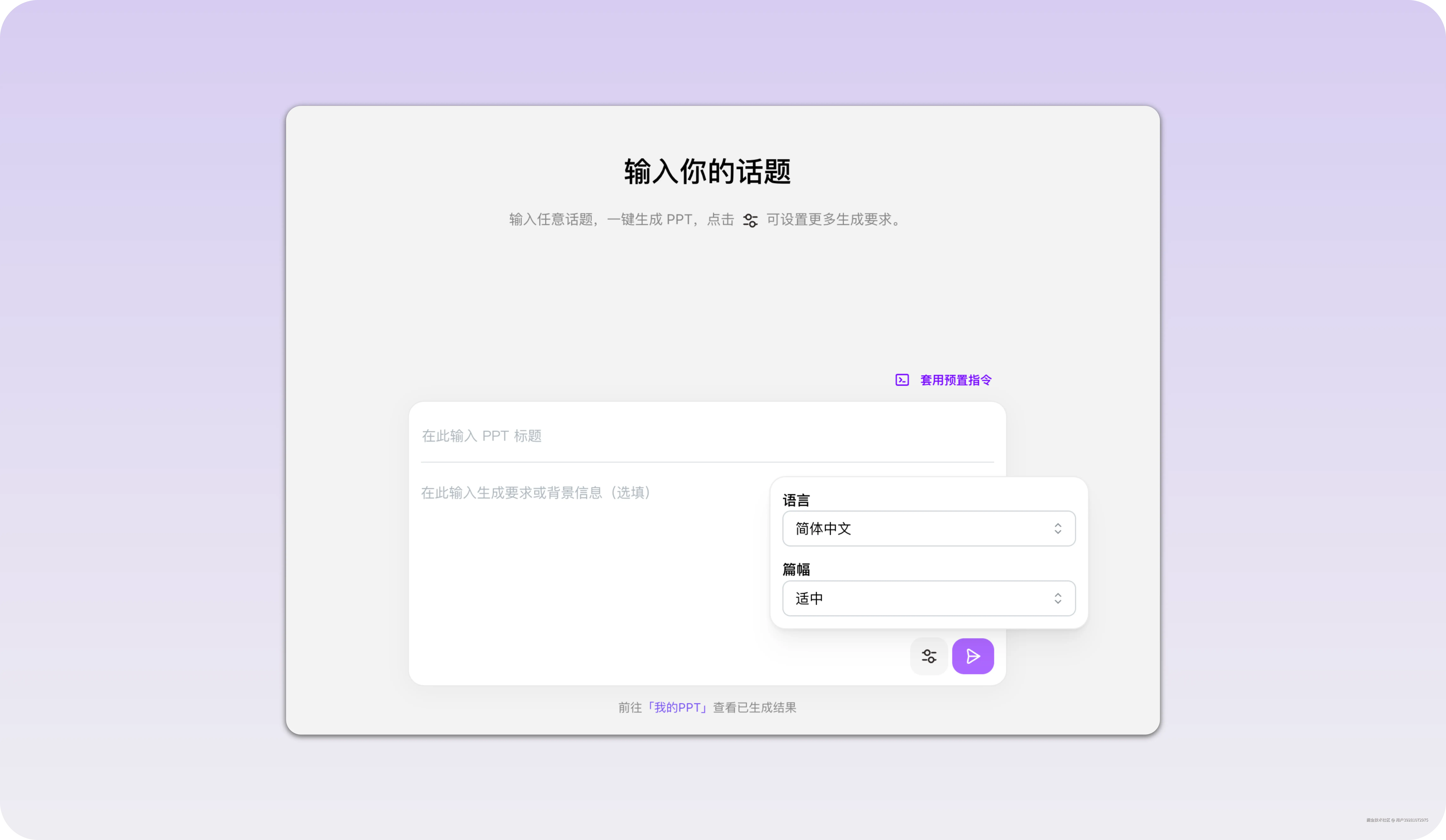 只需输入一个话题,歌者 PPT 就能迅速生成内容。不管是工作汇报、商业计划书,输入话题,内容立刻呈现。歌者 PPT 还会根据内容智能配图,同时支持设置篇幅长度和语言要求。