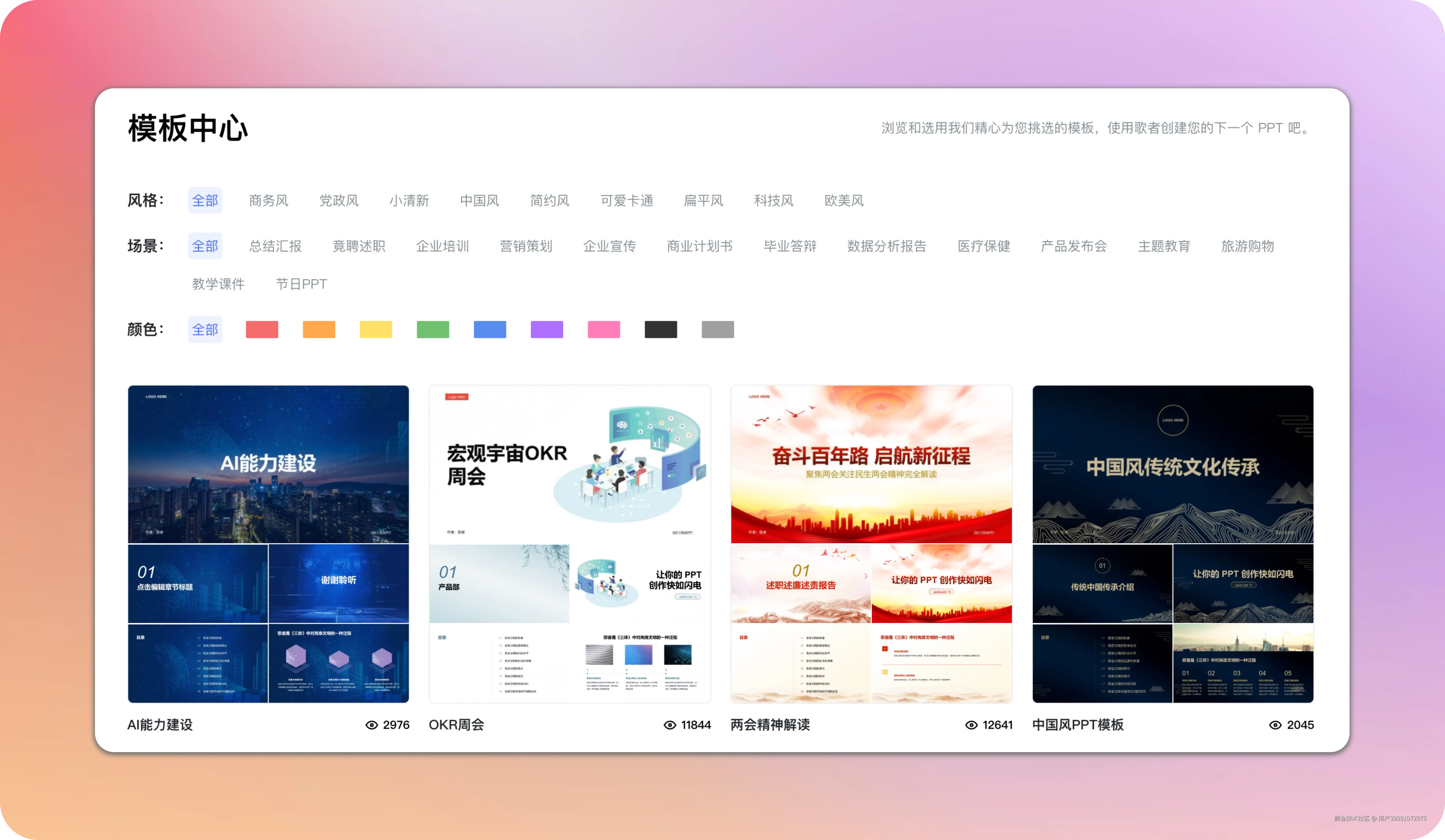 歌者 PPT 内置丰富的模板库与版式库,支持在生成 PPT 后随时切换模板与版式。此外,还允许用户自定义模板,打造符合个人或品牌风格的 PPT。