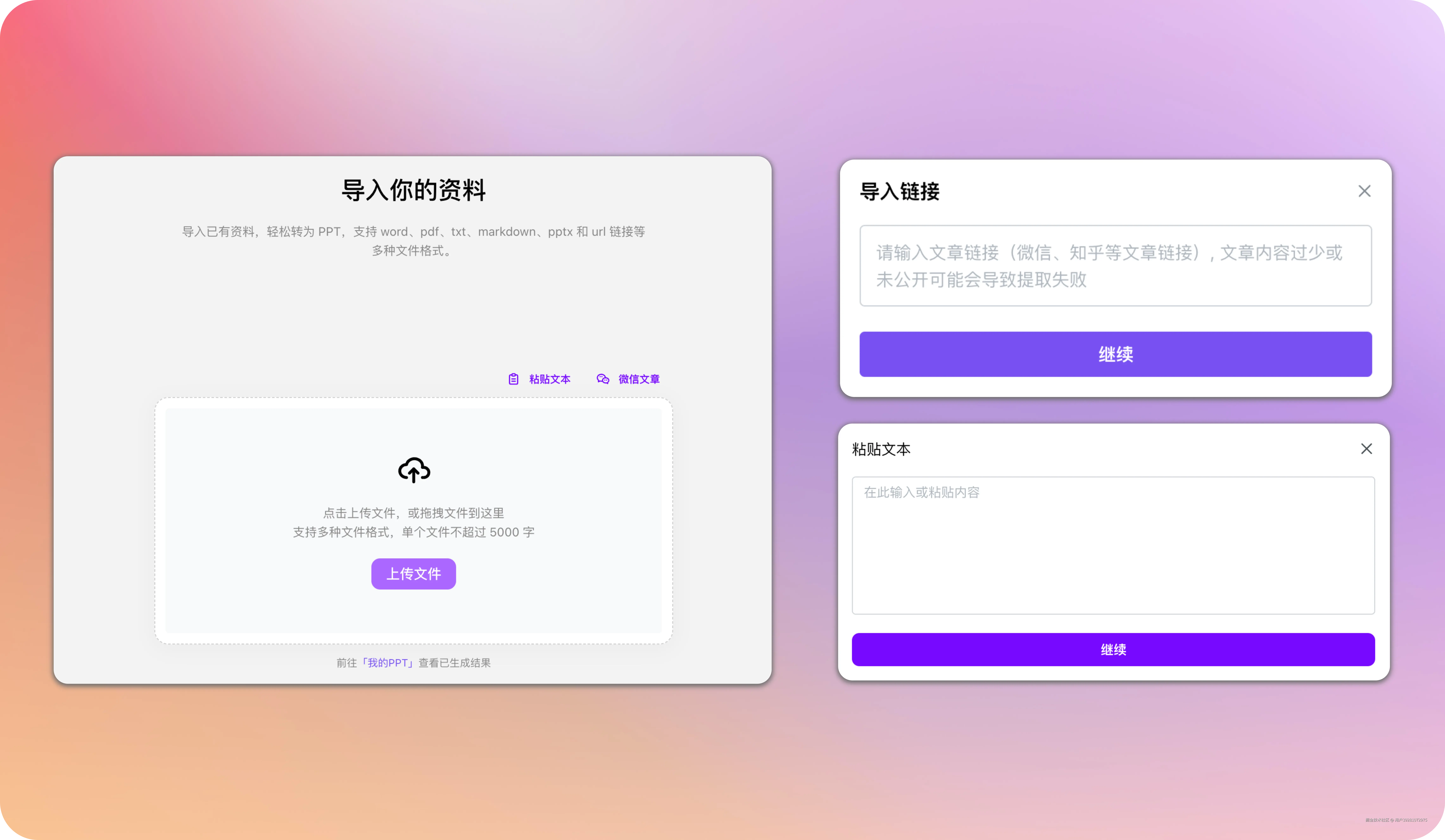 已有现成资料?歌者 PPT 支持 5 种主流文件格式导入生成 PPT,还能直接导入链接、粘贴大段文本。简单几步,资料就能迅速转为高质量 PPT,大大提升工作效率。