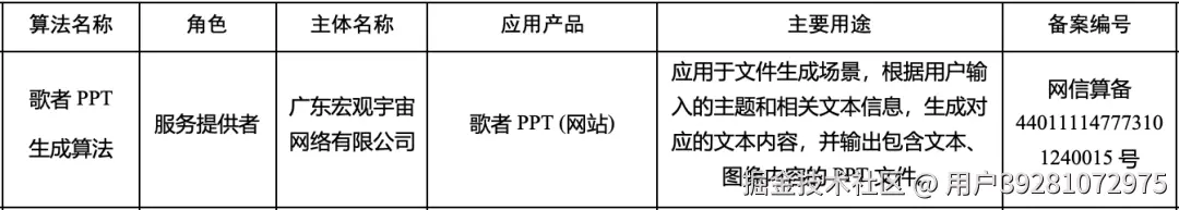 2024 年 8 月 5 日,国家网信办发布了第七批深度合成服务算法备案信息公告,**「歌者 PPT 生成算法」在经过严格的评估与审查后,顺利通过深度合成服务算法备案!**备案编号:440111147773101240015。