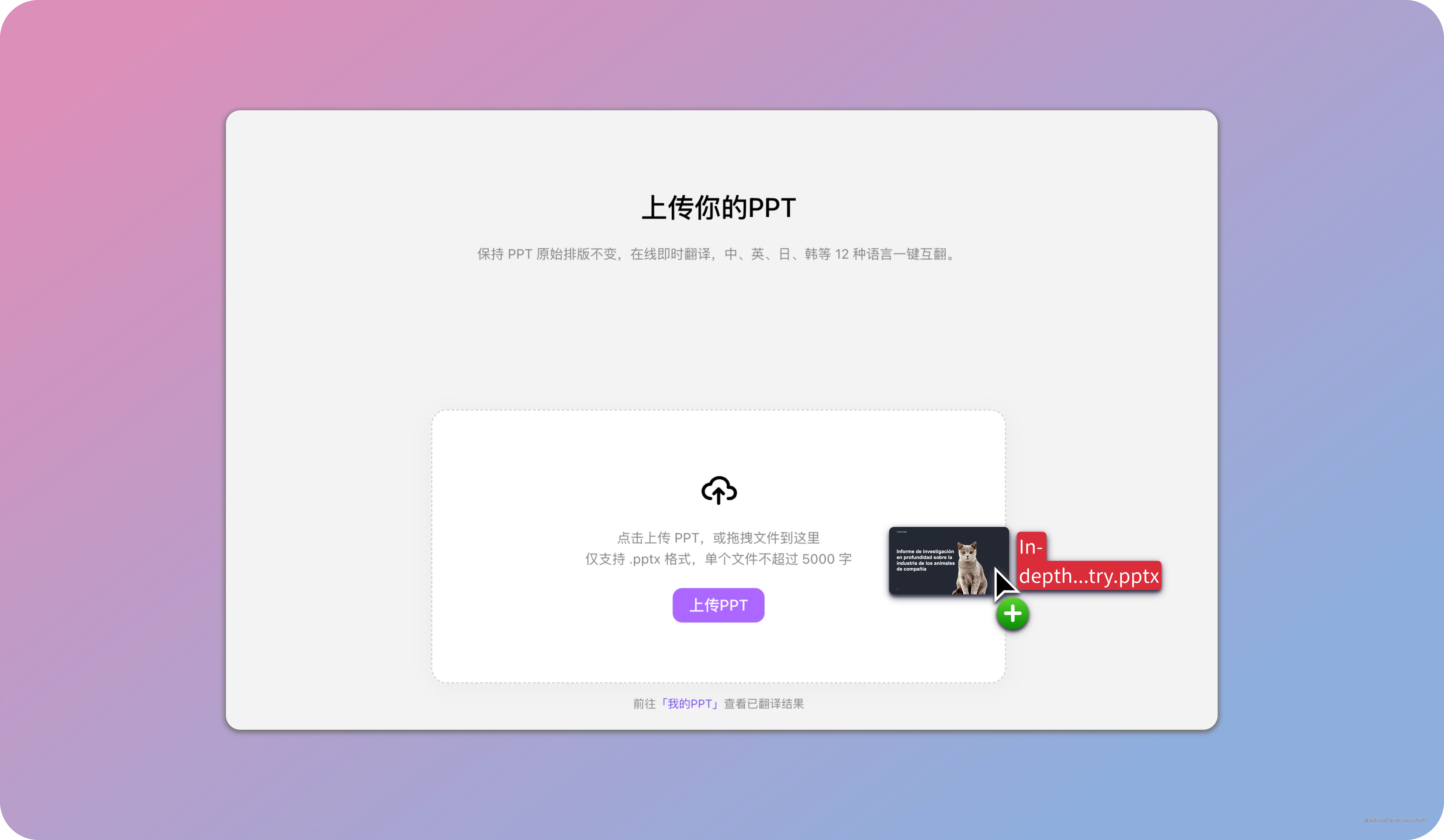 歌者 PPT 支持包括中、英、日、法、西等 12 种语言互译。只需将 PPT 上传,歌者 PPT 会在保持原始格式排版不变的前提下,智能理解原文内容并进行精准翻译。翻译完成后,你可以直接下载翻译好的 PPTX 文件到本地。