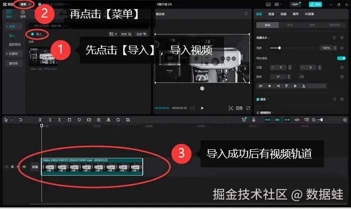 步骤二:成功导入视频文件后,只需点击 【导入】 按钮选择文件,一旦视频轨道显现,即表示导入成功。接着,点击页面左上角的 【菜单】 选项,即可进行后续操作。