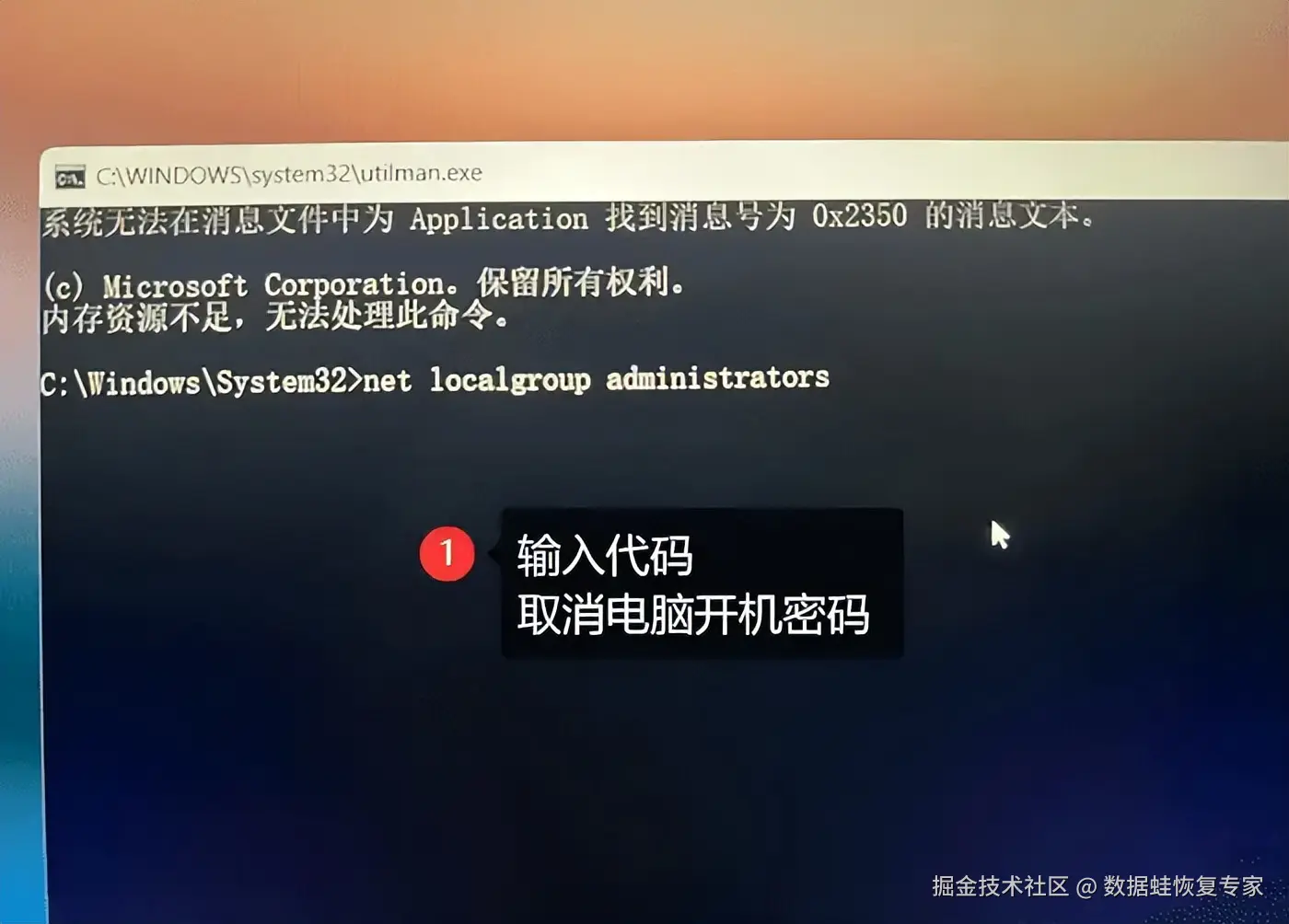 步骤五:使用命令提示符解除电脑密码