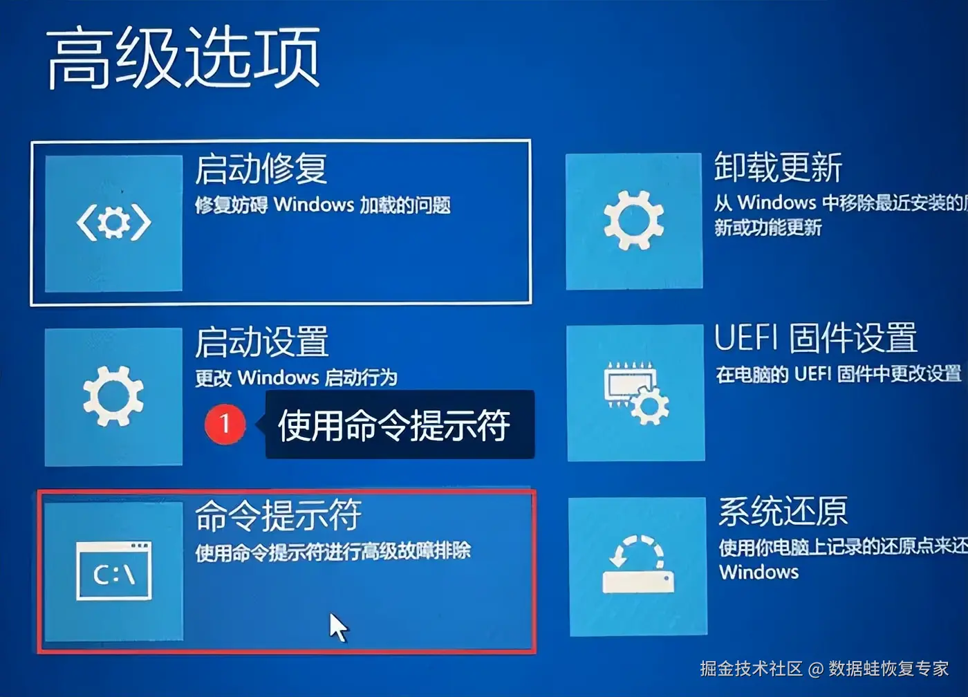 在高级选项中,你需要点击 【命令提示符】 ,这是忘记电脑开机密码的解决方法的关键一步。然后,就可以进行下一步啦。不过,这里我们需要以管理员身份运行命令提示符,所以请确保自己拥有管理员权限哦。