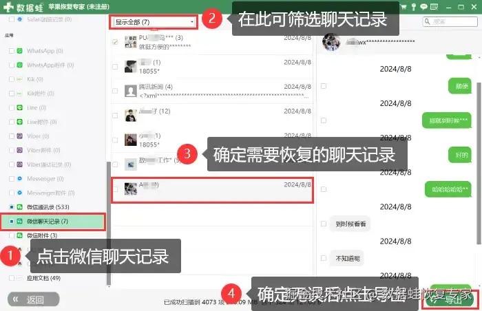 步骤3:扫描结果出现我们选择点击 【微信聊天记录】 ,通过 【筛选器】 快速查找您需要恢复的聊天记录,选择好聊天记录后点击 【导出】 按钮即可。