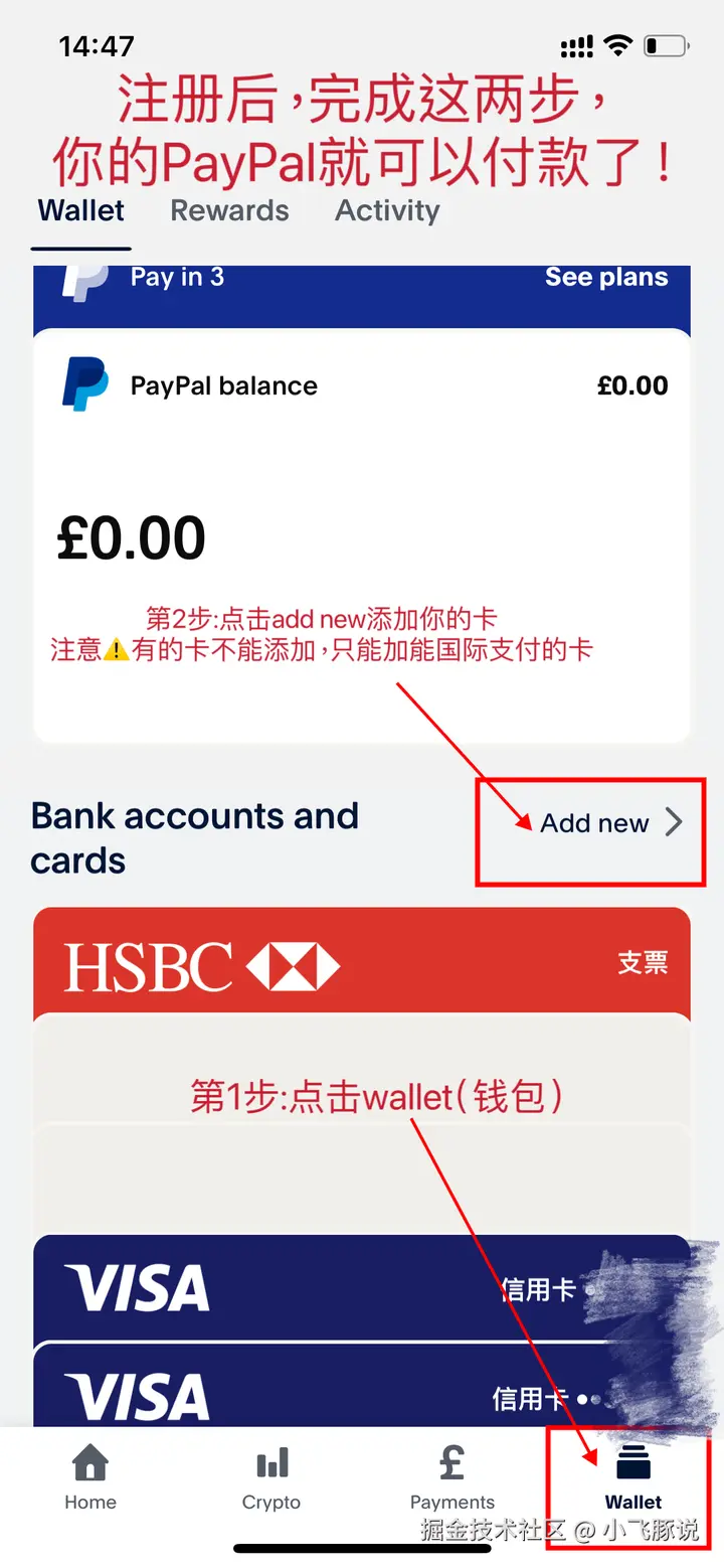 除此之外,PayPal也是个不错的选择。它可以绑定信用卡、借记卡什么的,操作也不复杂。先下载PayPal,注册,之后按照图示步骤添加好银行卡,最后进入ChatGPT订阅,在支付页面选PayPal,登录账号就能搞定。