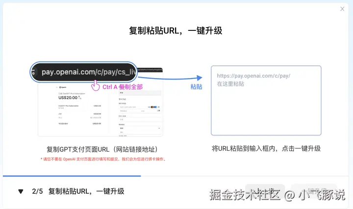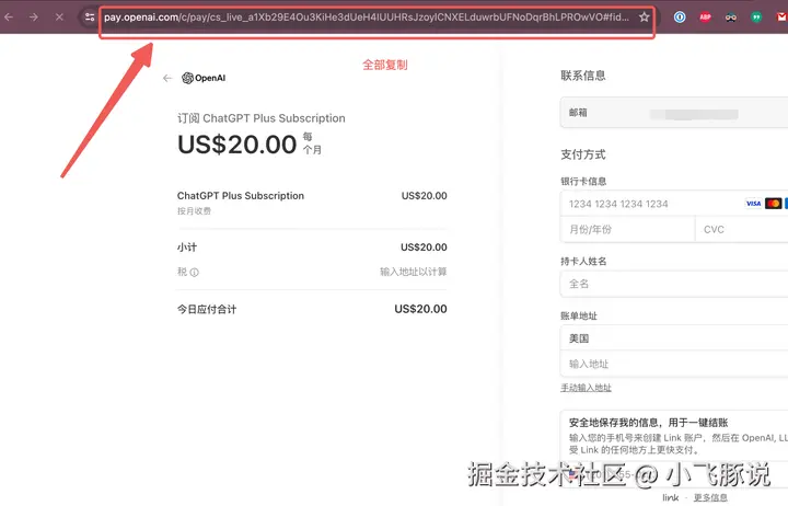 在支付页面,复制现在的付款页网址 URL,这一段 pay.openai.com 开头的全部网址,进入我们「一键升级 ChatGPT Plus」页面,提交就可以了。不需要在支付页面填写任何信息,如果填写过,要返回上一步,重新进入这个页面再复制网址。