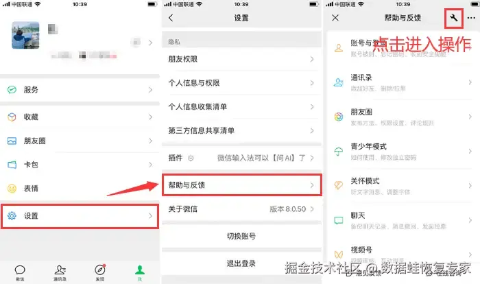 步骤1:打开微信后,点击右下角的 【我】 ,进入 【设置】 并选择 【帮助与反馈】 。通过点击右上角的 【修复】 标志进入。