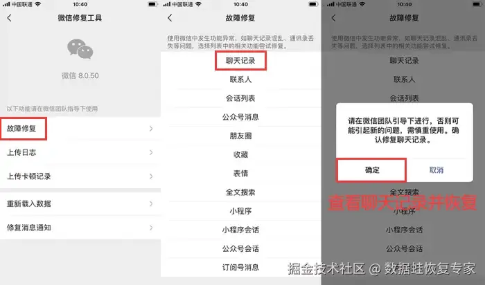 注意:微信自带的故障修复工具主要针对软件异常导致的聊天记录丢失,对于卸载后重新安装的情况,恢复效果十分有限。