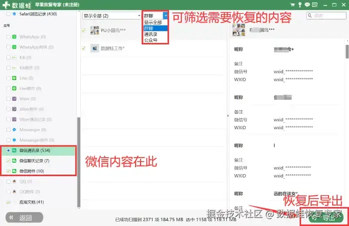 步骤3:扫描完毕之后,在左边目录中找到并点击 【微信聊天记录】 选项,筛选自己想要恢复的聊天记录,最后点击右下方恢复并进行导出即可。