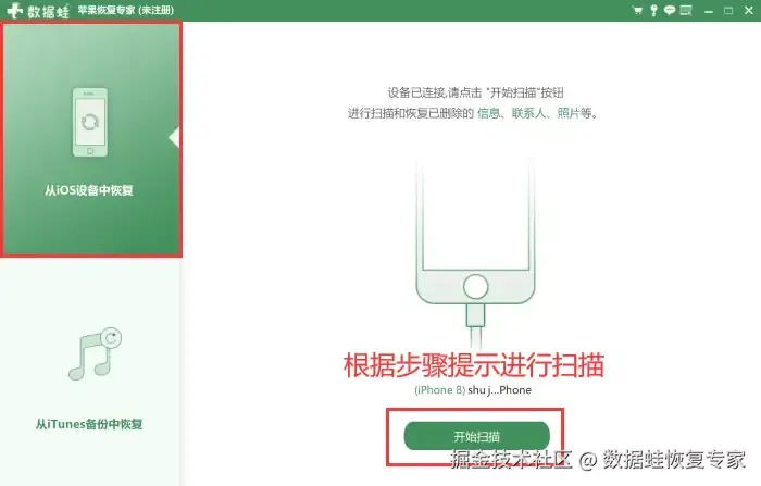 步骤1:安装好软件后进入数 据 蛙苹果恢复专家页面,用数据线将手机与电脑连接成功后,点击 【开始扫描】 等待即可。