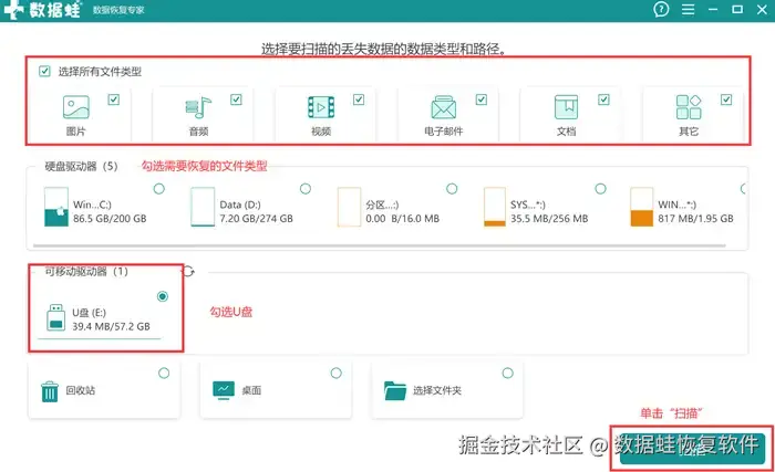 步骤2: 选择主页面上需要恢复的文件类型和U盘(提前确认好U盘是否能够正常被识别),单击“扫描”。