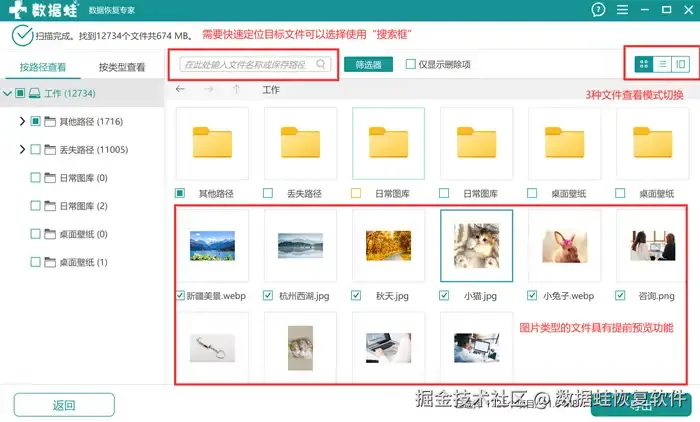步骤3: 扫描完成后,需要快速完成U盘数据恢复的用户可以选择使用搜索框工具,在里面输入文件名或保存路径即可快速定位目标文件。