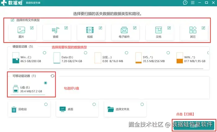 第2步: 在软件的主页面上,将需要扫描的是数据类型和u盘勾选好,最后点击【扫描】。