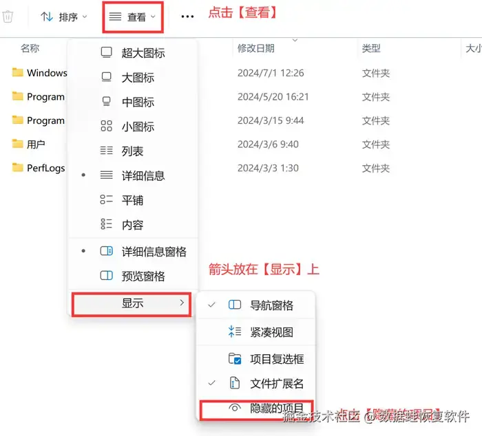 步骤2: 点击上方的【查看】,鼠标下滑找到【显示】,点击【隐藏的项目】便可以显示被隐藏的项目,如果U盘数据丢失是因为误触隐藏文件,这个操作可以实现找回U盘数据。