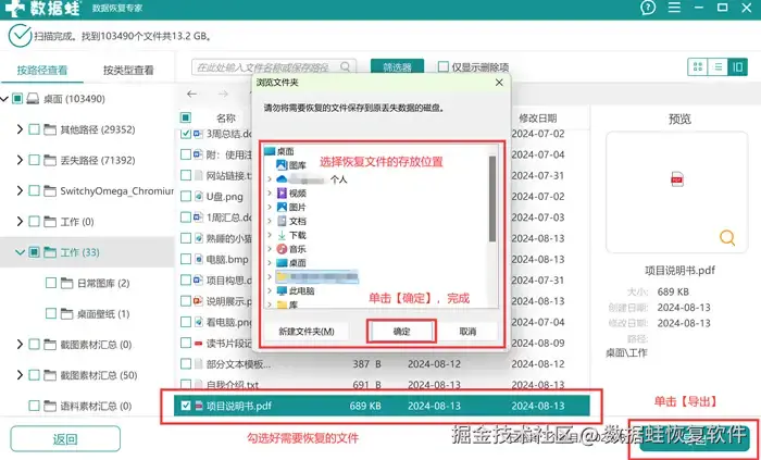 第4步: 选择好后,点击【导出】,最后选好恢复文件的存储位置就能够实现U盘数据的恢复了。