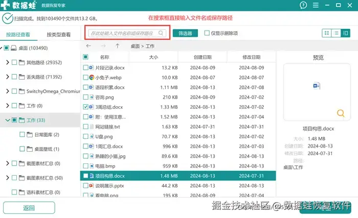 第3步: 结果出现后,可以选择直接使用搜素框,在里面输入文件名或保存路径,定位目标文件的位置。