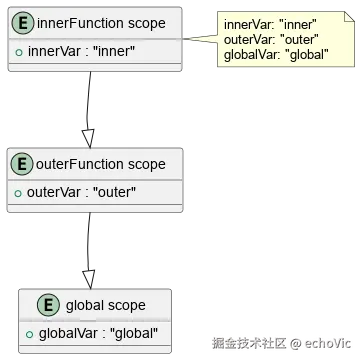 下图显示了innerFunction 如何通过作用域链访问外部函数变量(outerVar)和全局变量(globalVar)。