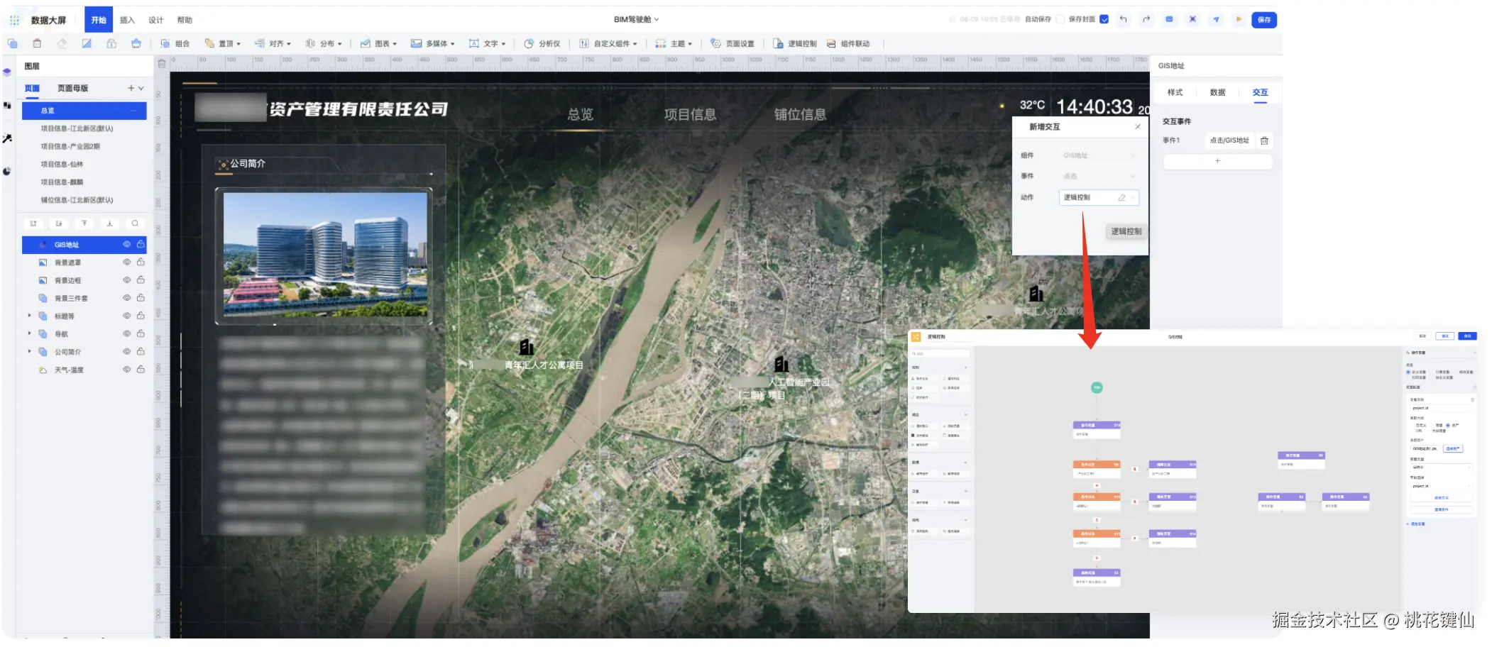 带GIS地图的公司信息展示大屏,配置会比上一类稍微麻烦一点。虽然smardaten中也自带2D/3D地图,可以根据经纬度去做打点,但想要实现点击地图点位就刷新该点位的公司简介信息,我们还需要进入逻辑控制,传参项目id过滤,地图与详情的联动展示就可以配置实现了。