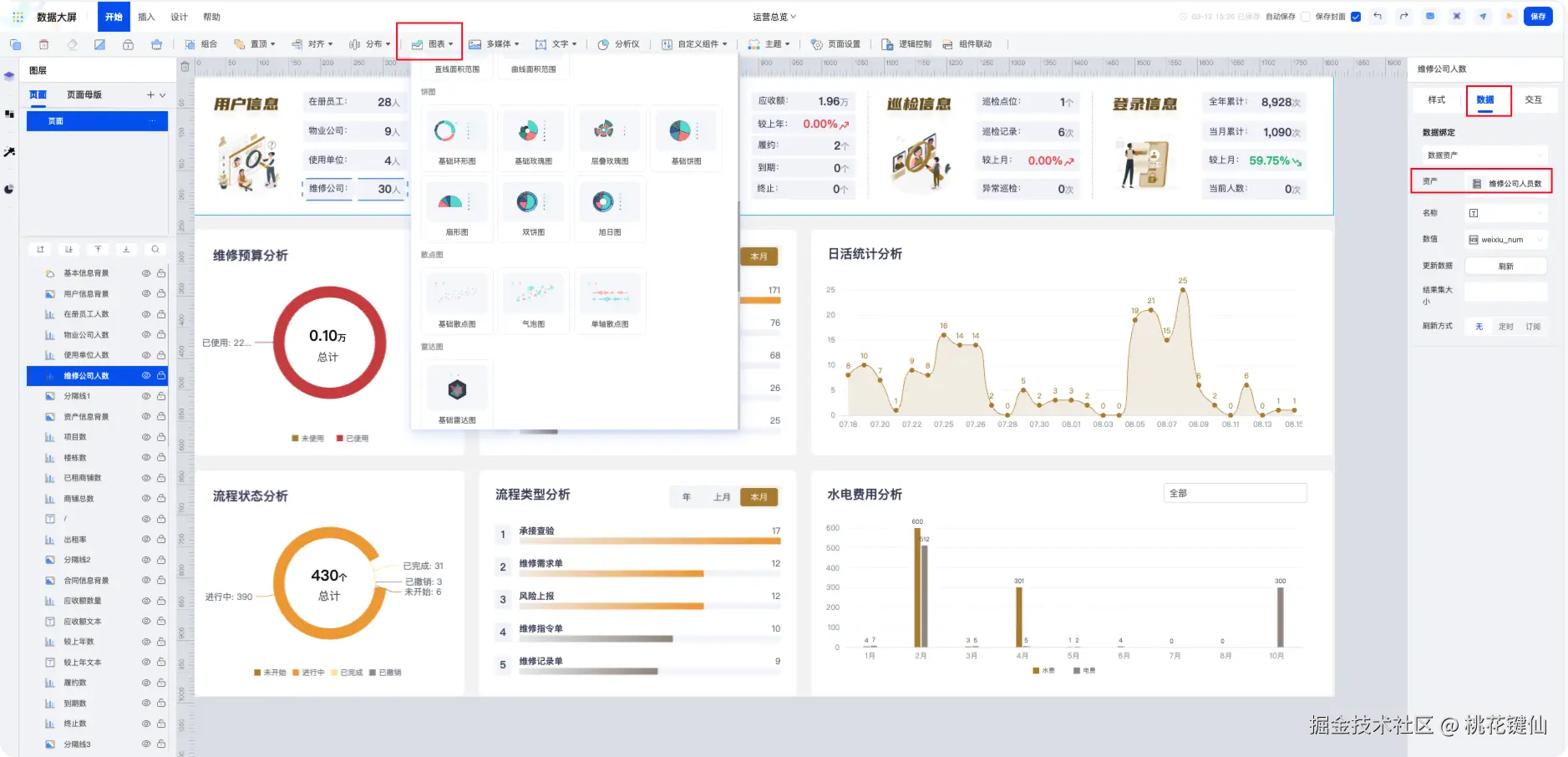 总览大屏和工单中心配置起来比较简单,都是利用布局组件将页面分区后,直接拖入平台中的图表类型到相应位置,最后对图表进行数据绑定,将静态数据替换成数据库中的资产数据即可。